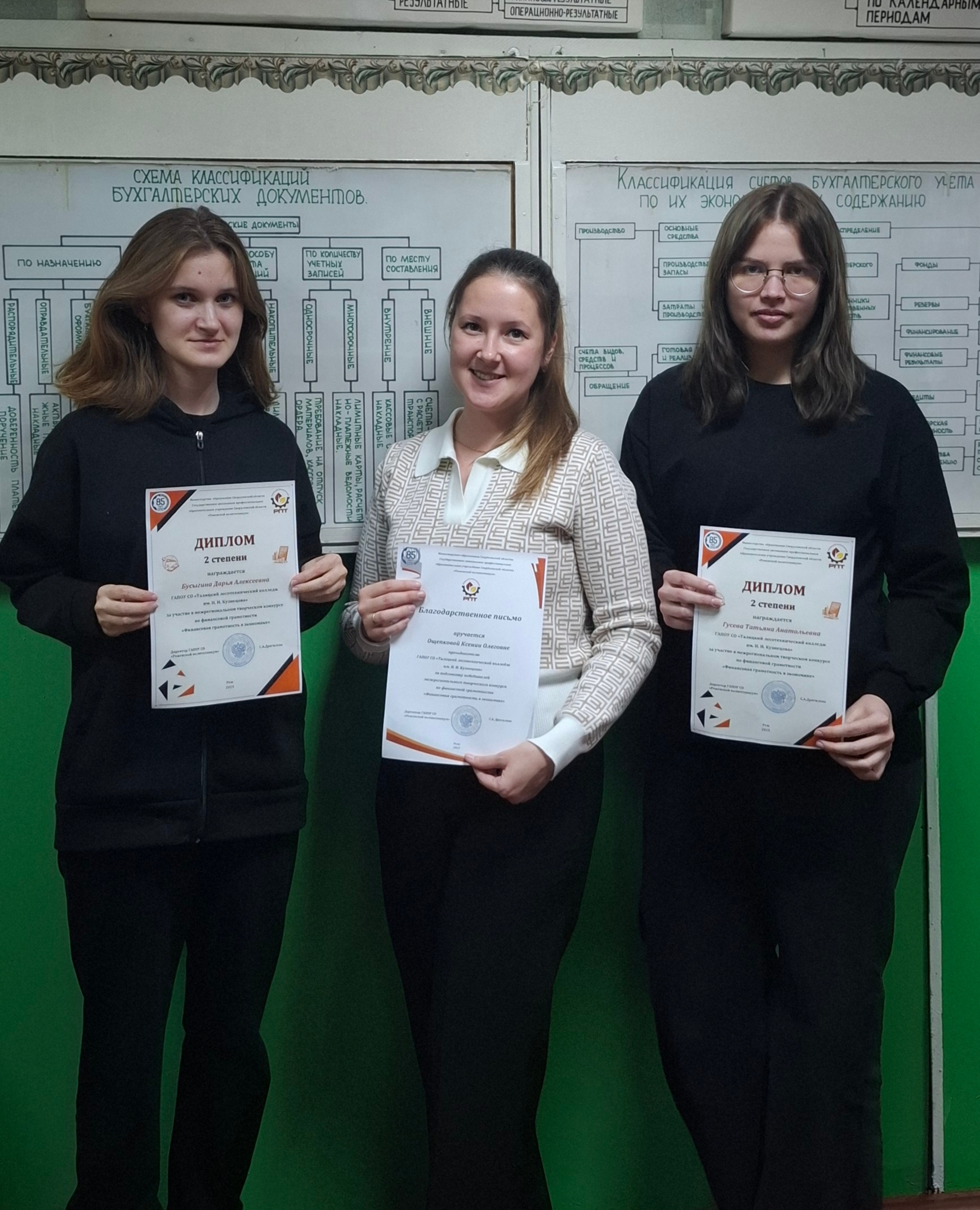 С 20 по 25 октября 2025 года шесть студентов Талицкого лесотехнического колледжа им. Н.И. Кузнецова приняли участие в Межрегиональном творческом конкурсе «Финансовая грамотность в экономике», проводимом ГАПОУ СО «Режевской политехникум». Участие приняли обучающиеся группы БУ 32: Бусыгина Дарья Алексеевна, Гусева Татьяна Анатольевна, Кобелева Татьяна Анатольевна, занявшие почетное 2 место под руководством преподавателя Ощепковой Ксении Олеговны, и еще трое студентов из Тугулымского филиала колледжа - Малкова Полина Динаровна, Рех Алина Александровна, Ласкина Евгения Валерьевна под руководством Косаревой Анастасии Георгиевны получили дипломы участника. Целью конкурса являлось развитие экономического образа мышления, воспитание ответственности и нравственного поведения в области экономических отношений в семье. Всего в конкурсе приняли